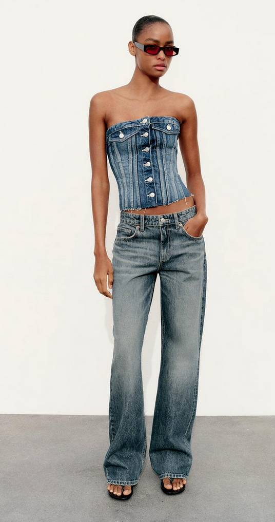 🔝 Top: The star of this outfit is undoubtedly the Corset Style Denim Top from Zara's TRF collection. This piece adds a trendy edge to the classic denim look, hugging your curves in all the right places while maintaining a casual vibe. The structured corset detailing gives it a unique twist that's sure to turn heads.