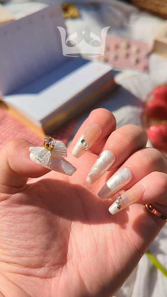 El set "Mermaid's Treasure" de Che Naildid ofrece un hermoso color blanco nacarado. eso es perfecto para novias.