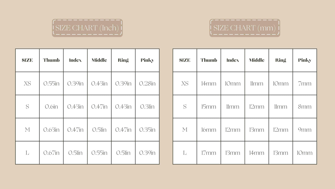 Compare su medida con la siguiente tabla. Es posible que no encuentres que todas las uñas coincidan con la tabla, busca el tamaño que más se adapte a tus uñas.