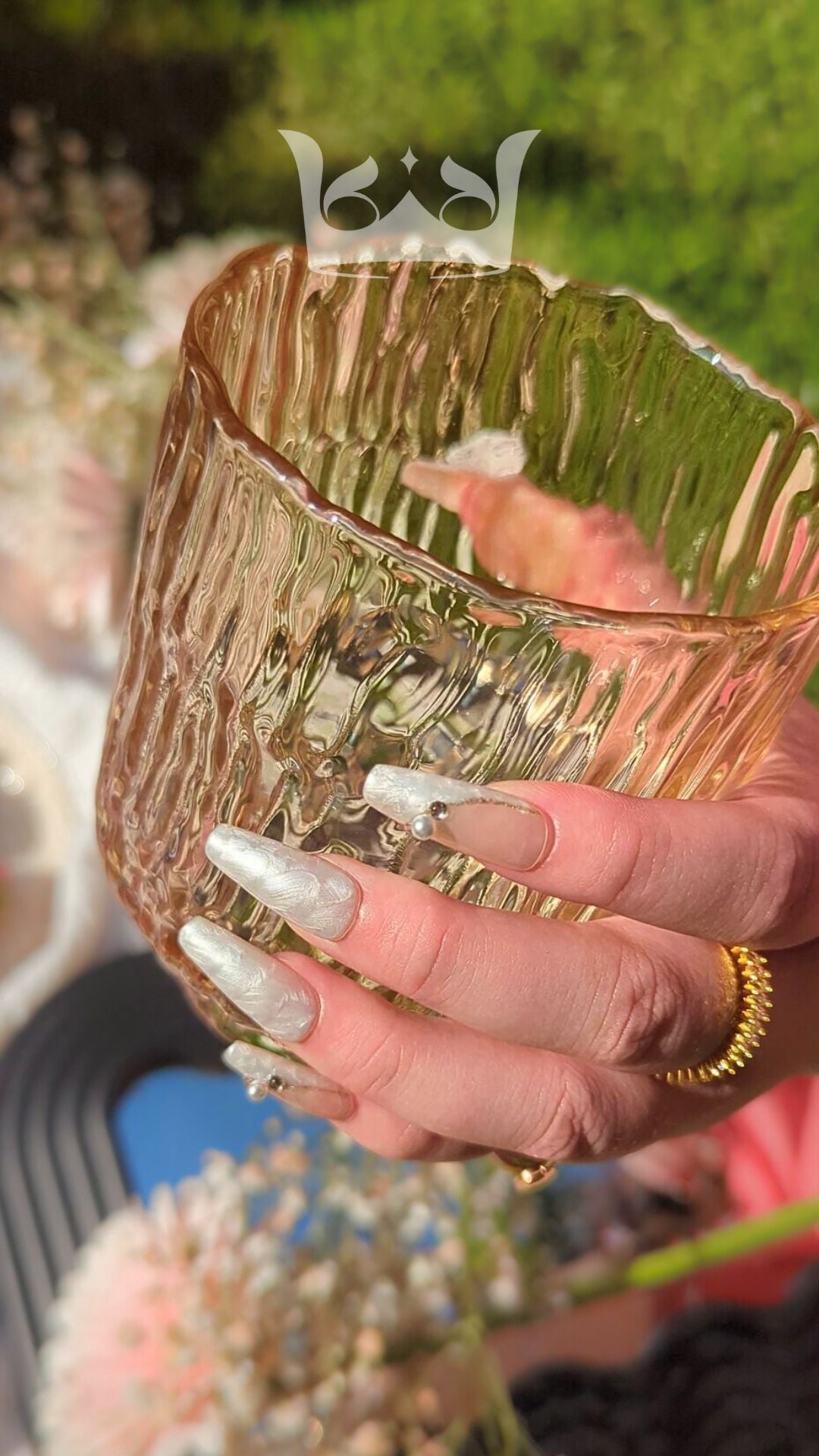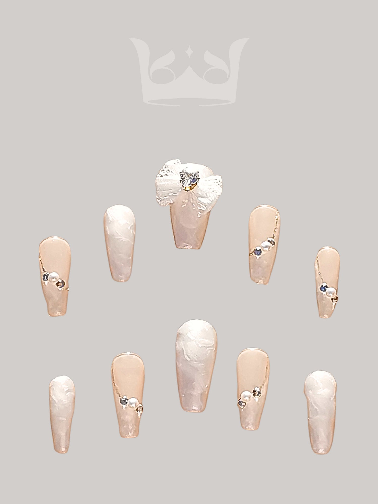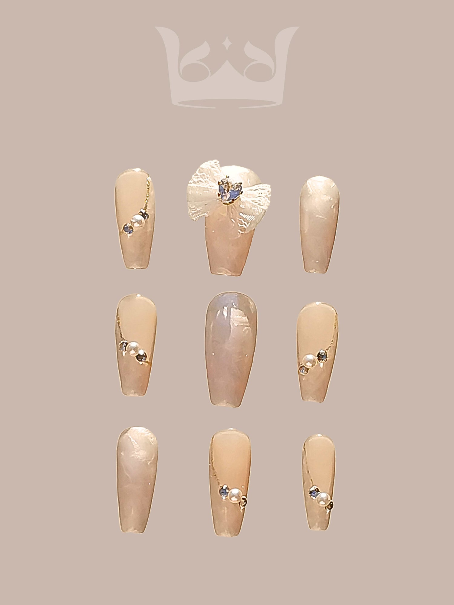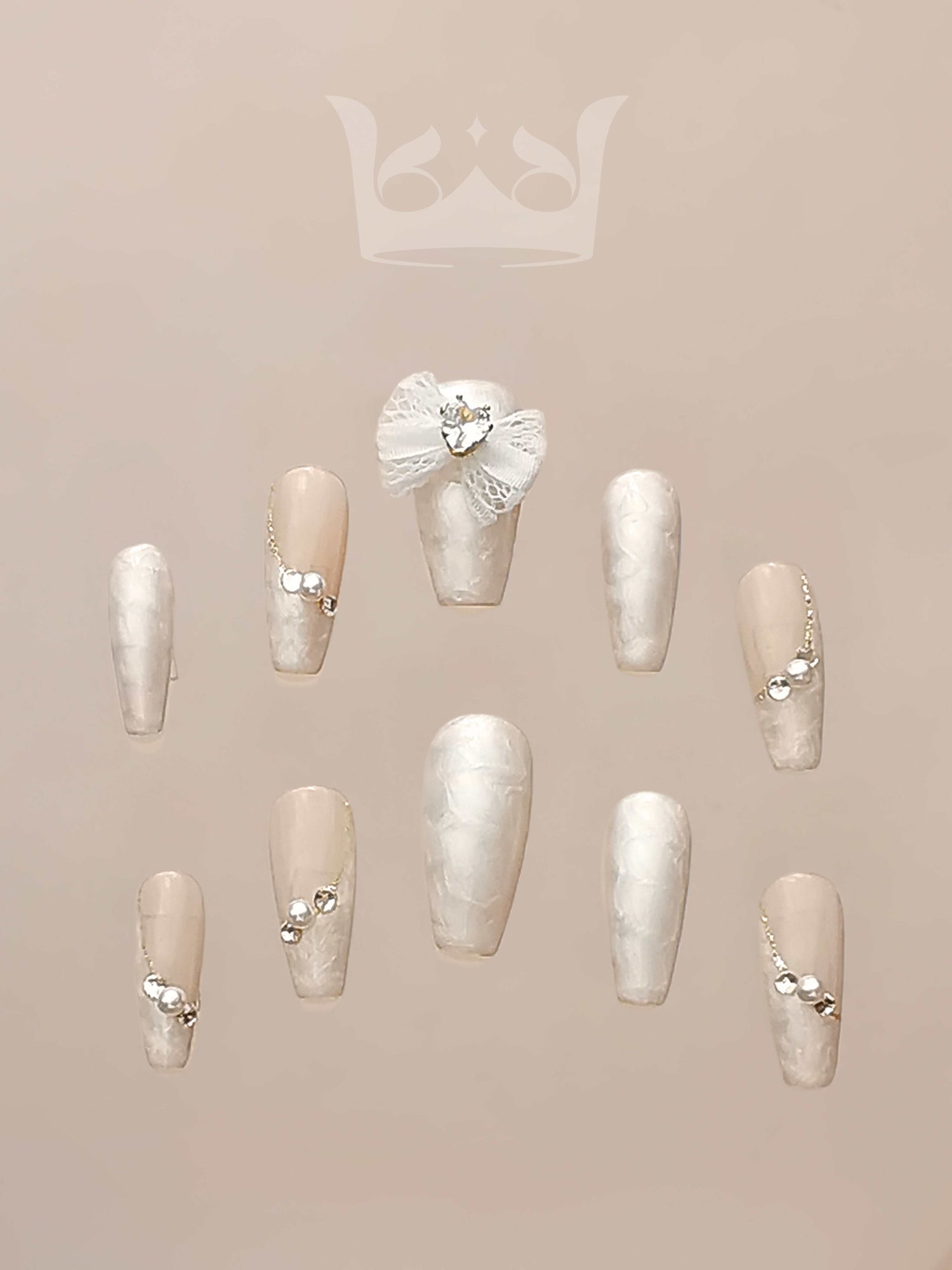 Usando Pearlescent Perfection el día de tu boda, captura el espíritu de la belleza clásica. Los diamantes aurora brillan fascinantemente en estas uñas a presión del tamaño de un ataúd, que son una tranquila combinación de blanco y nude. Un pequeño diseño de lazo añade un toque de elegancia. Eleva tu look nupcial con una combinación perfecta de romance y sofisticación, haciendo de Pearlescent Perfection la joya brillante a tu alcance. Con estas uñas, donde el encanto de las perlas, los diamantes y un pequeño lazo se unen para crear un momento absolutamente ideal en tu gran día, podrás hacer que cada gesto sea inolvidable.
