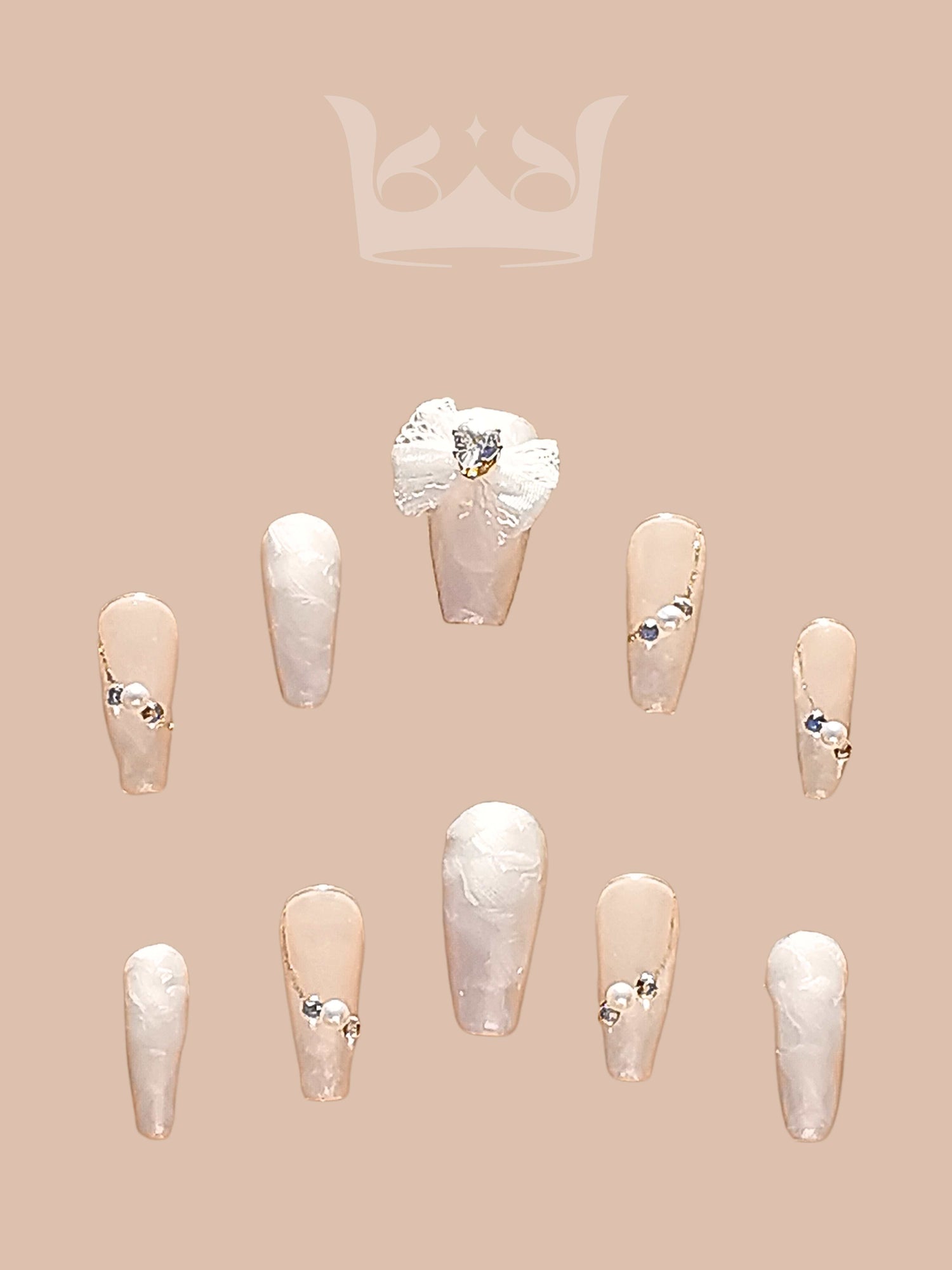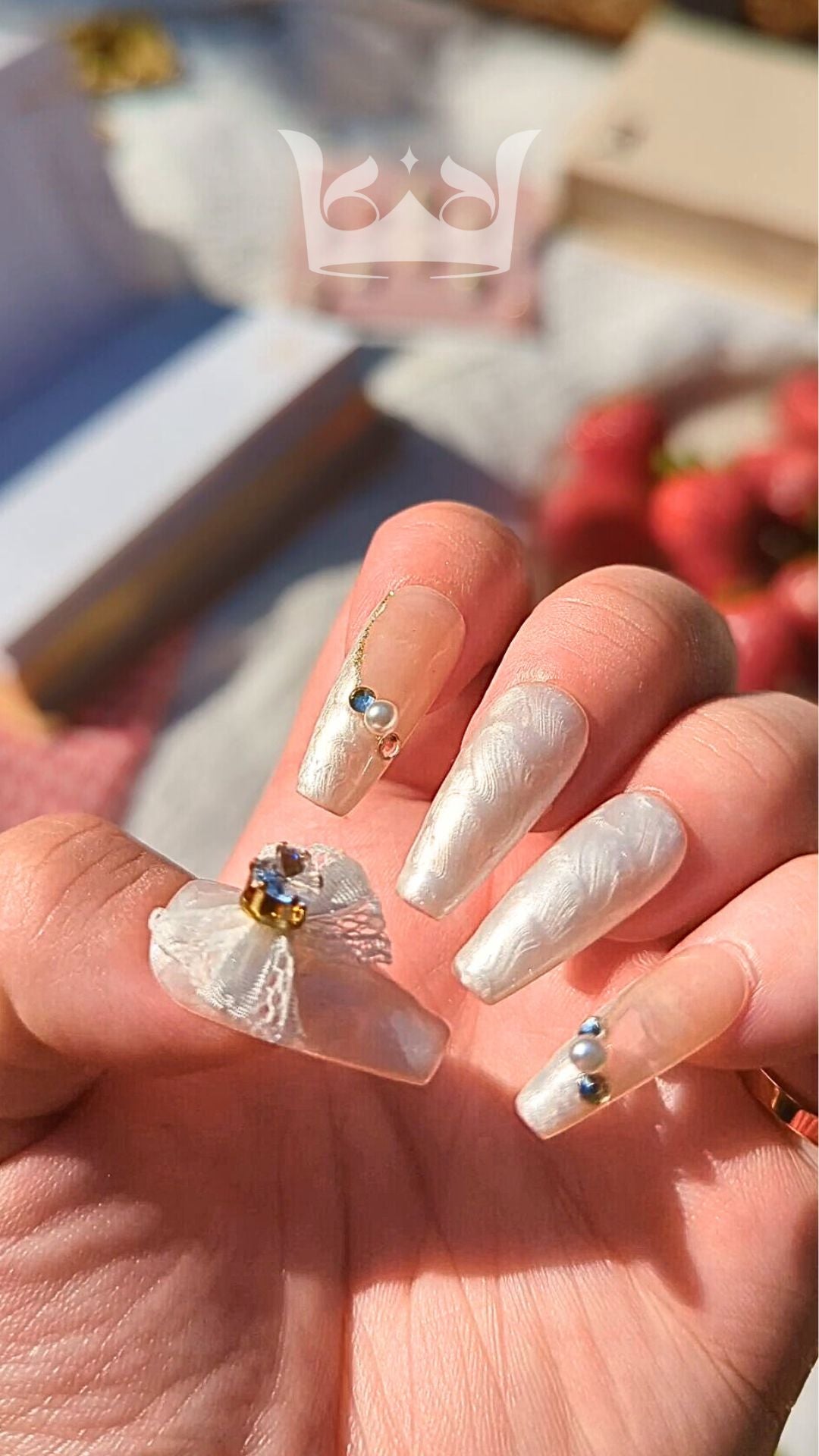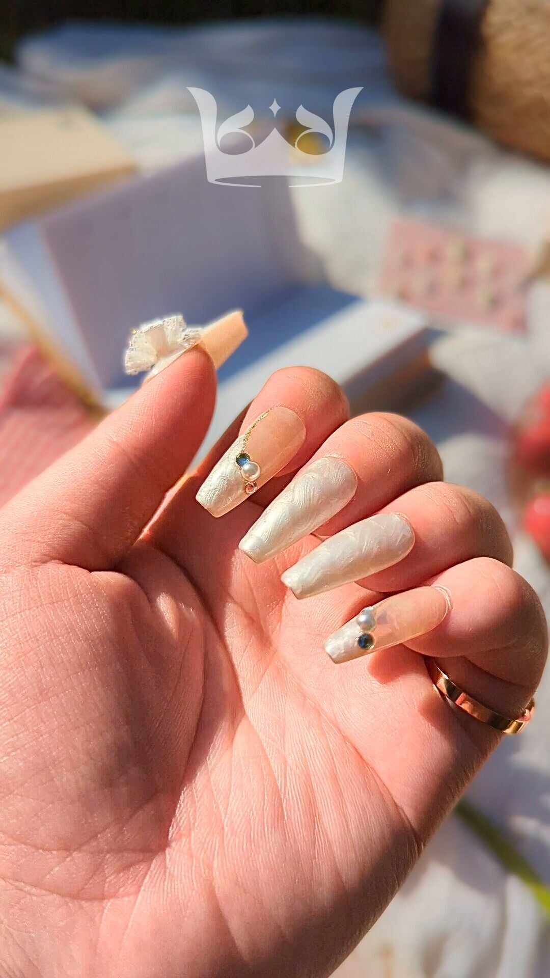 Perfección nacarada: uñas largas a presión en ataúd blanco y nude