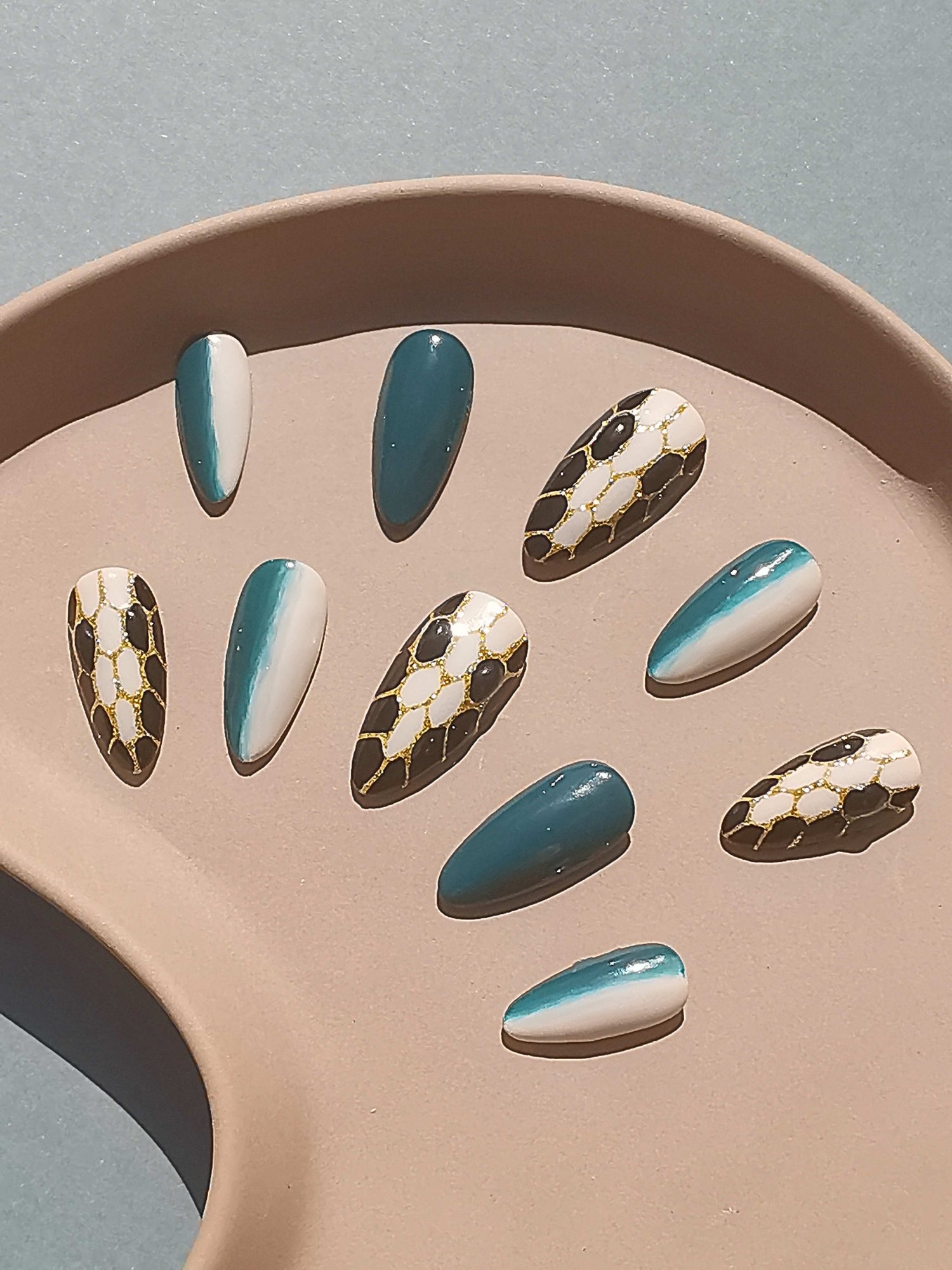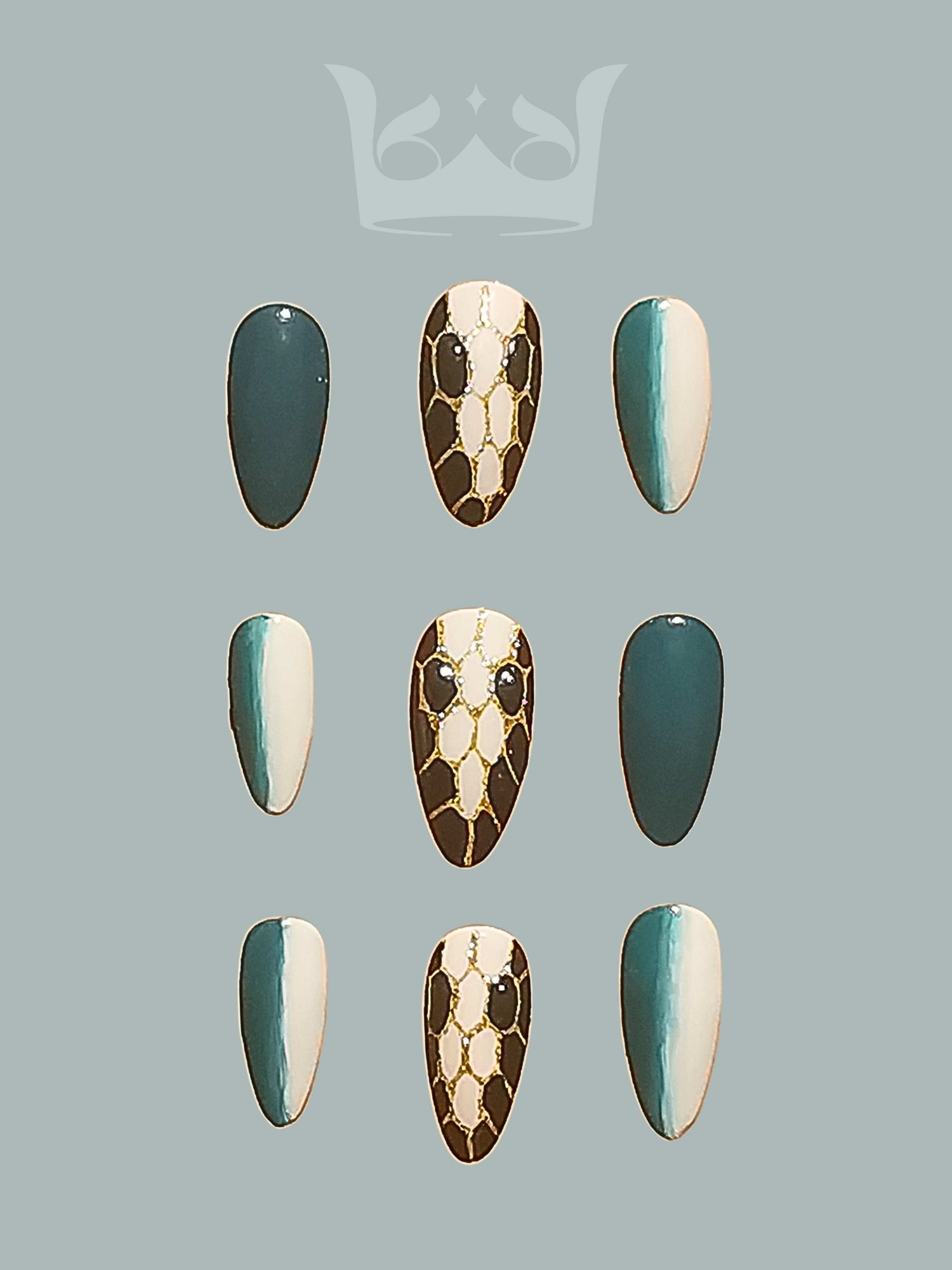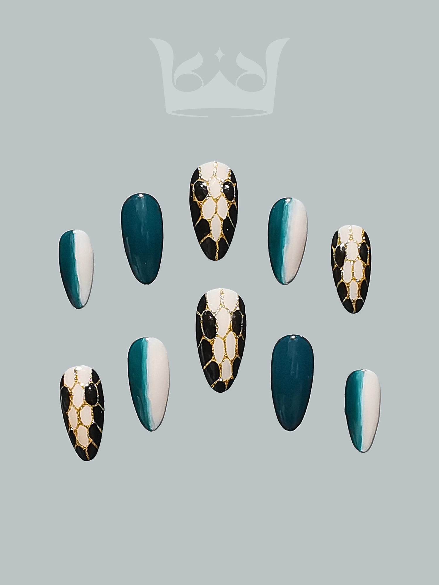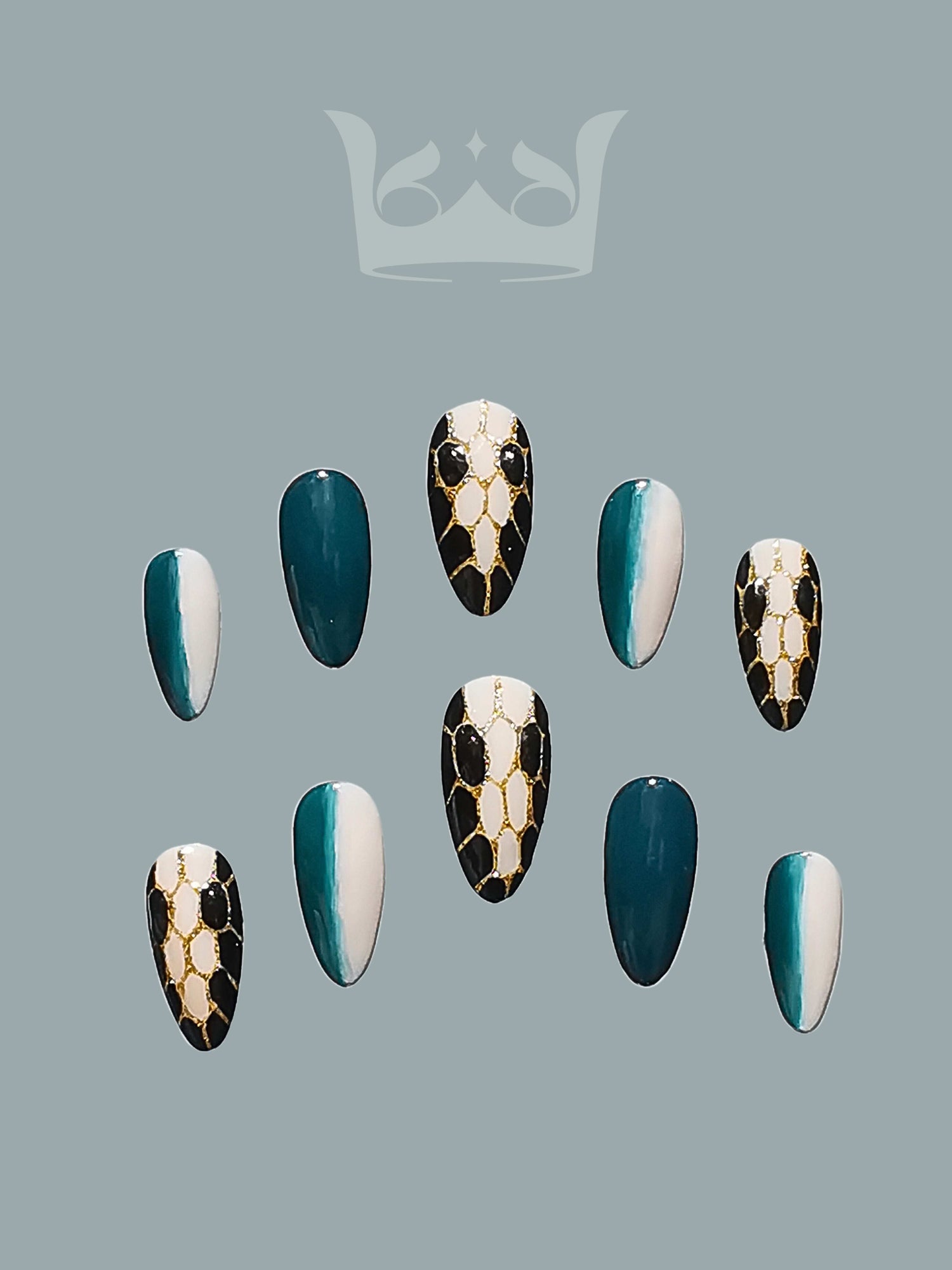 Descubre el encanto de Serpentine Seduction, mientras tus uñas se transforman en un arte misterioso y de moda. Estas intrigantes uñas largas a presión con diseño de aguja en degradado negro y verde están adornadas con un diseño de serpiente pintado a mano que les da un aire de encanto exótico. El diseño se ve realzado por los elementos esculpidos, que producen una atractiva combinación de refinamiento y textura. Haz una declaración con Serpentine Seduction y abraza el encanto de la elegancia inspirada en una serpiente en tus dedos.