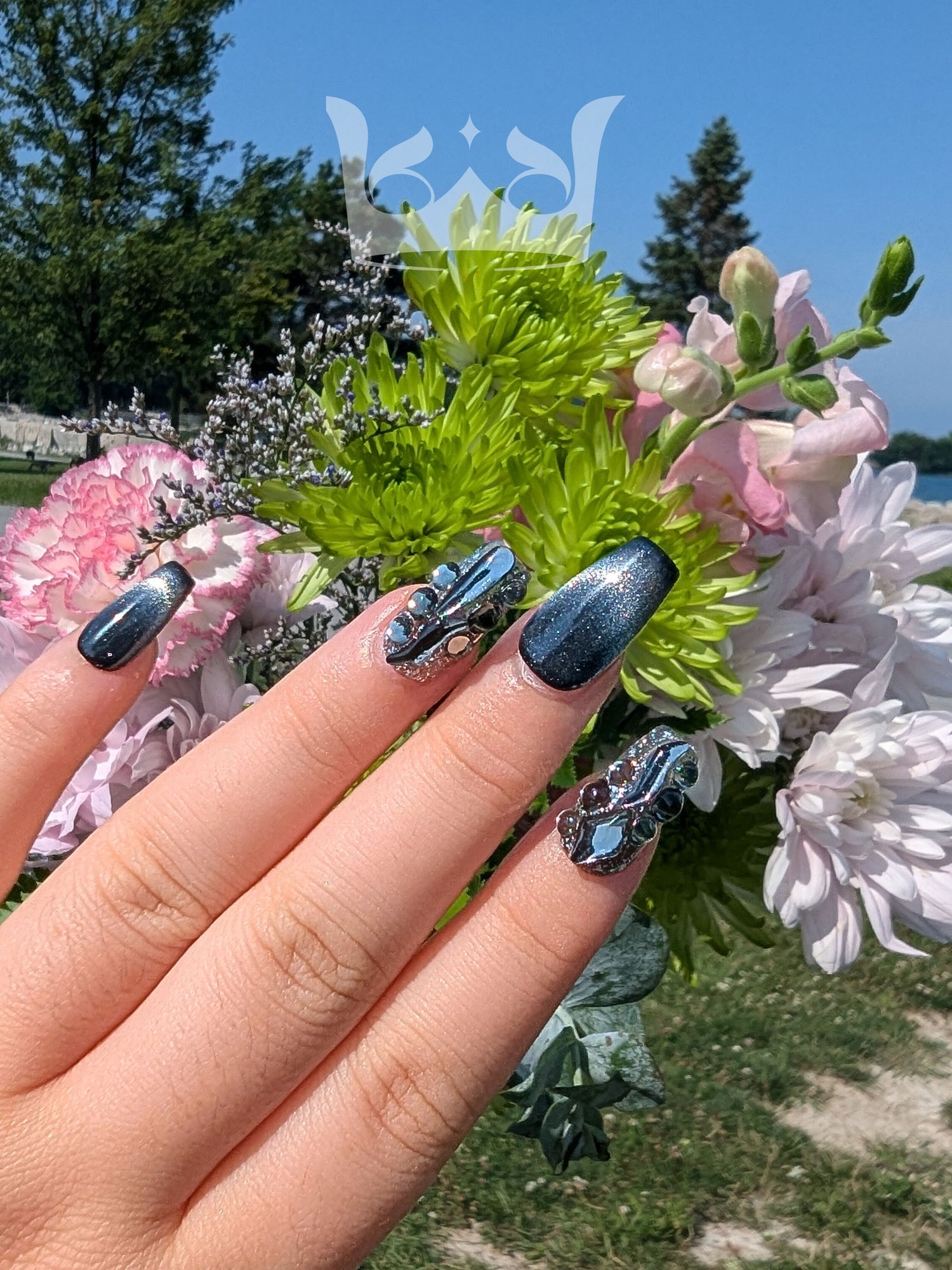 These aren't your grandma's press-ons (unless your grandma's a total badass). We're talking sleek black oval nails that'll make your fingers look like they just stole the night sky. But wait, there's more! We've sprinkled some diamond embellishments on there because, let's face it, you deserve to twinkle like a star even when you're just filing TPS reports.