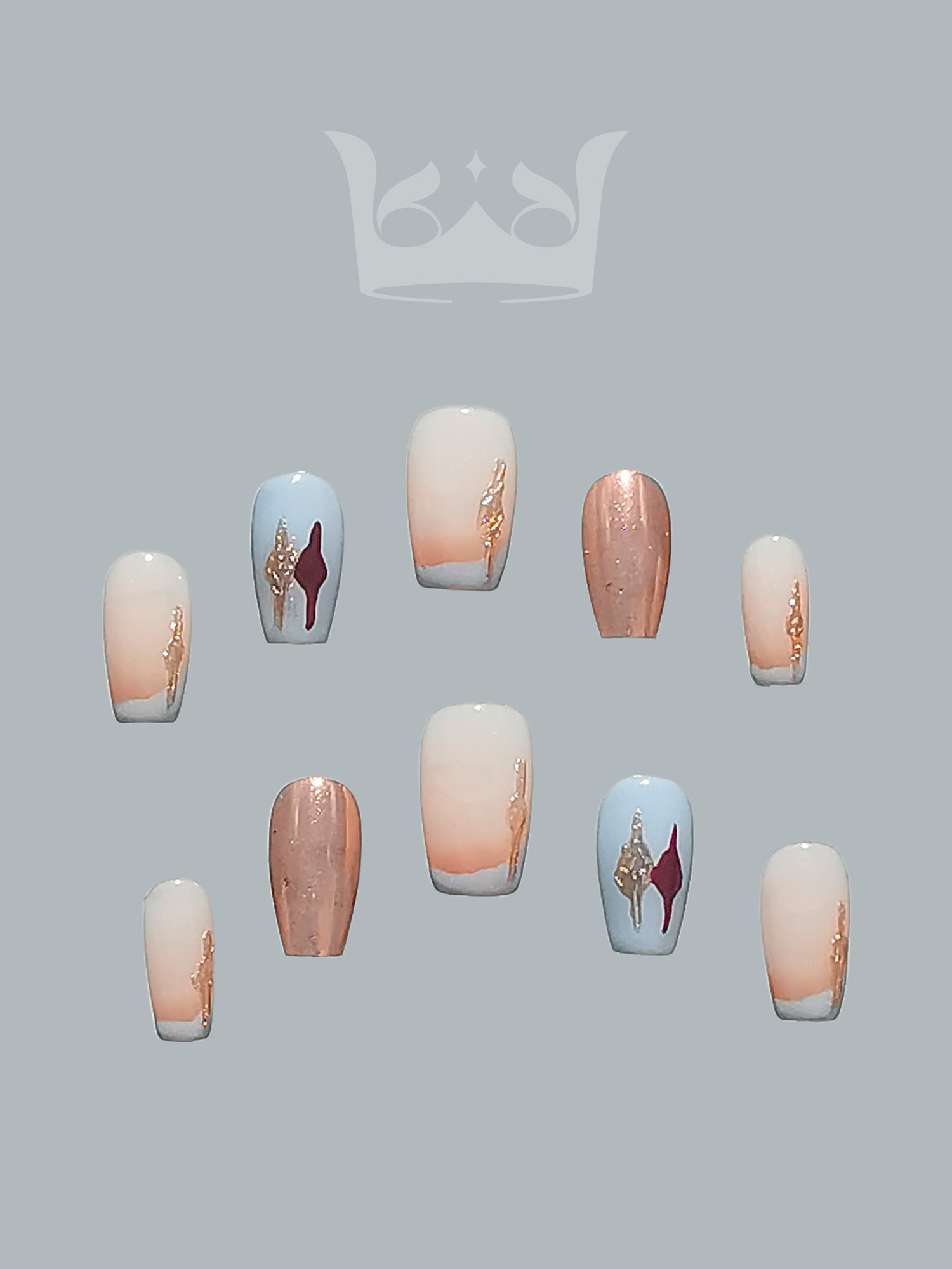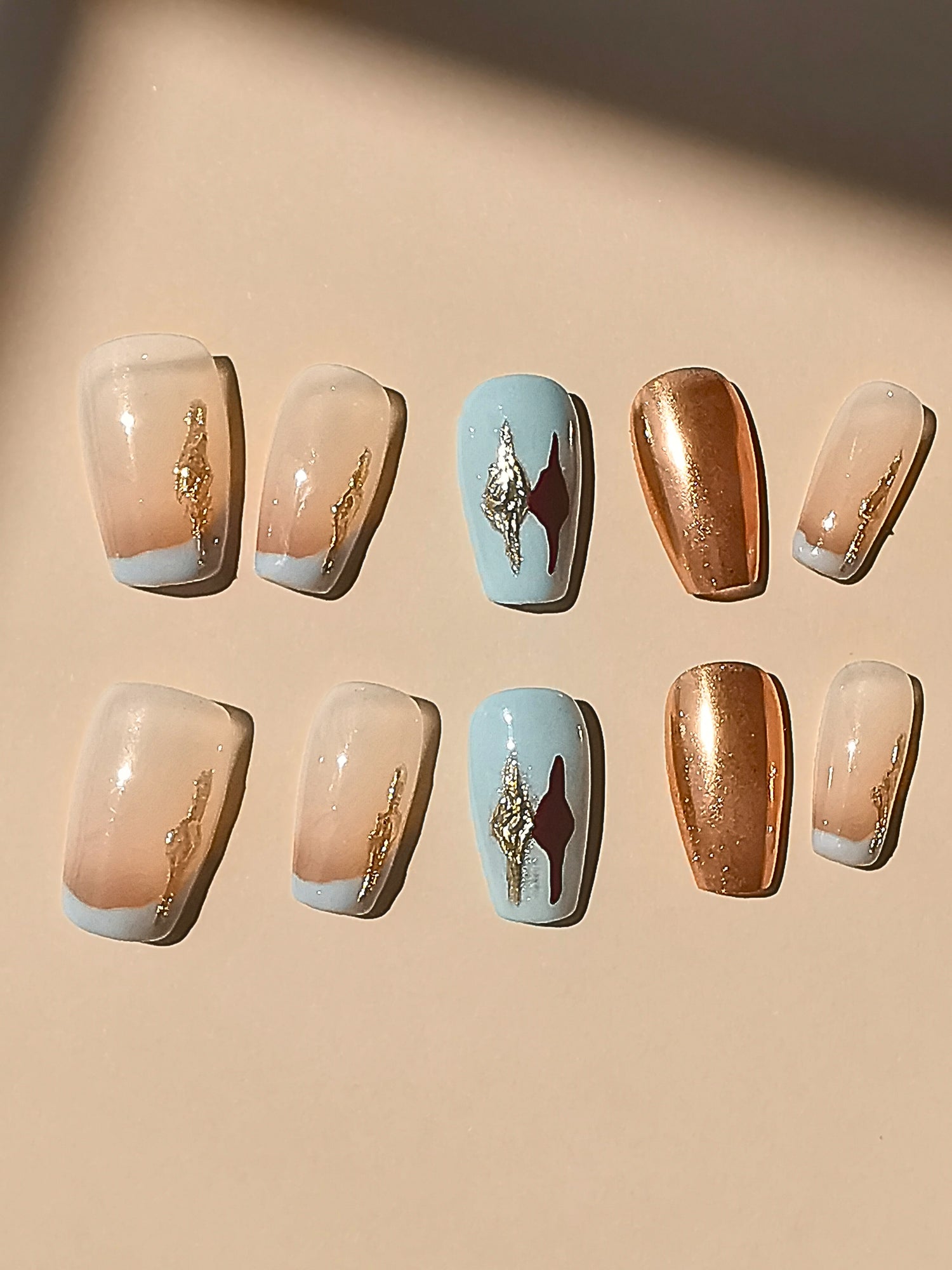 Bronzed Euphoria: Blue and Rose Gold Gradient Square Long PressOn Nails