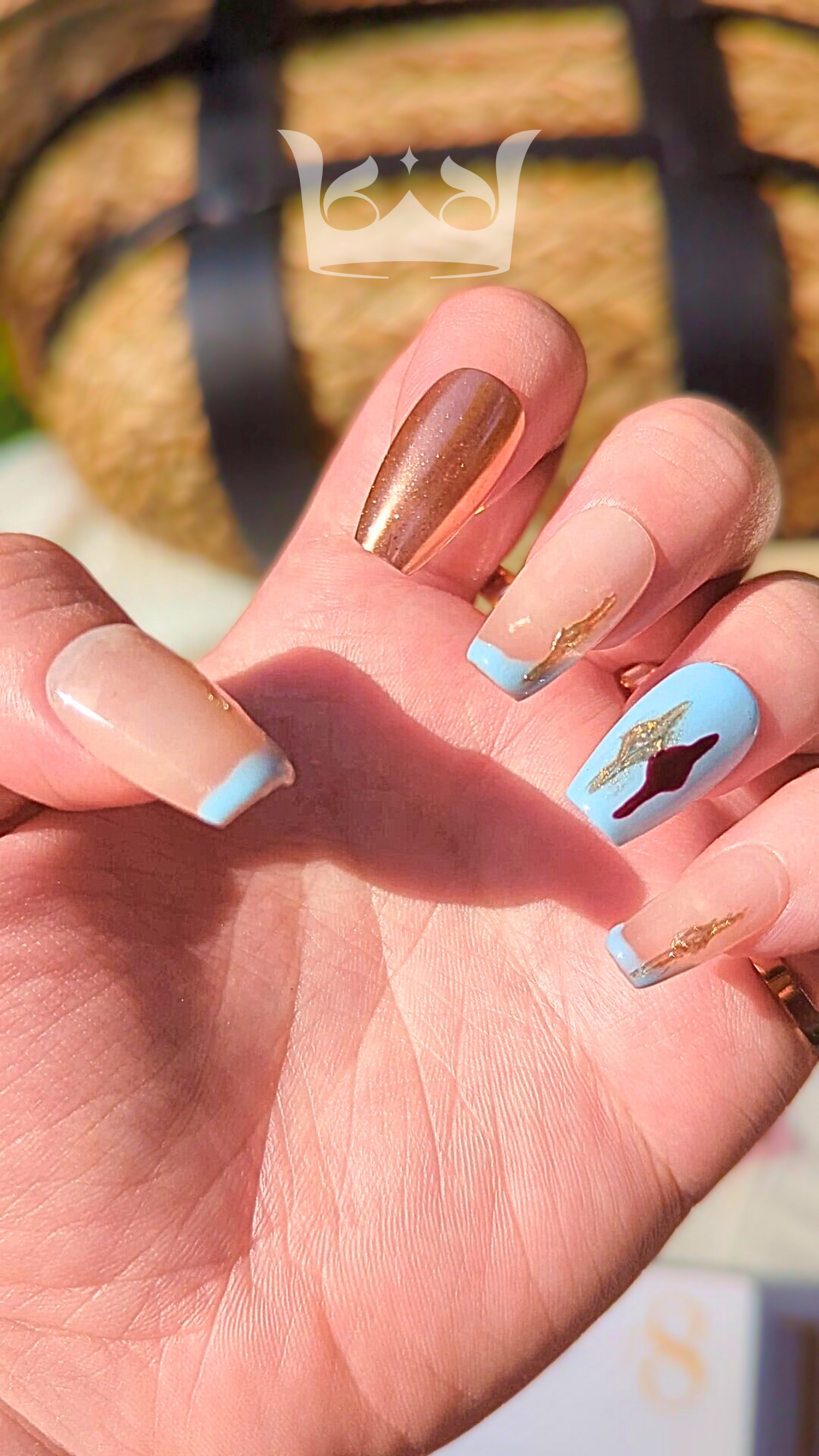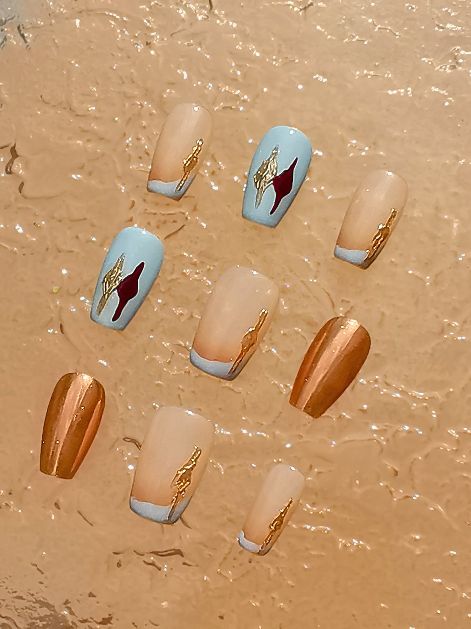 🌴 Dive into a world of sun-kissed elegance with our Bronzed Euphoria press-on nails. These aren't just any coffin shaped acrylic nails; they're your ticket to instant vacation vibes without the sandy inconvenience!