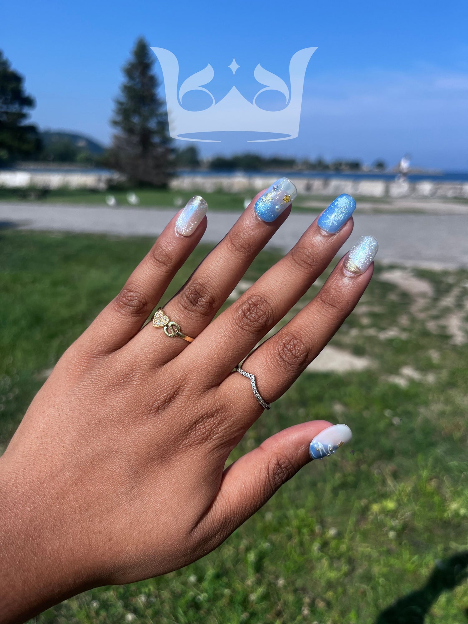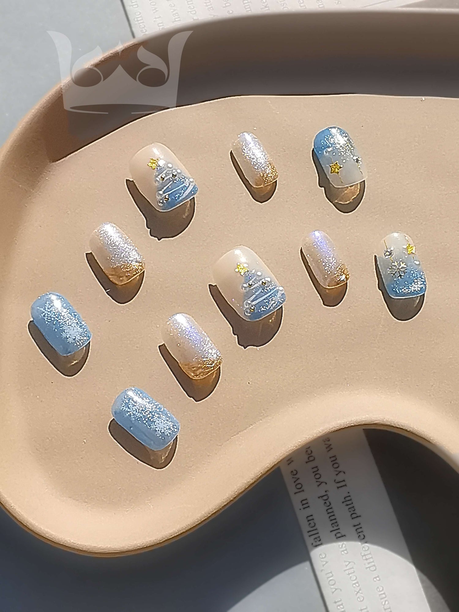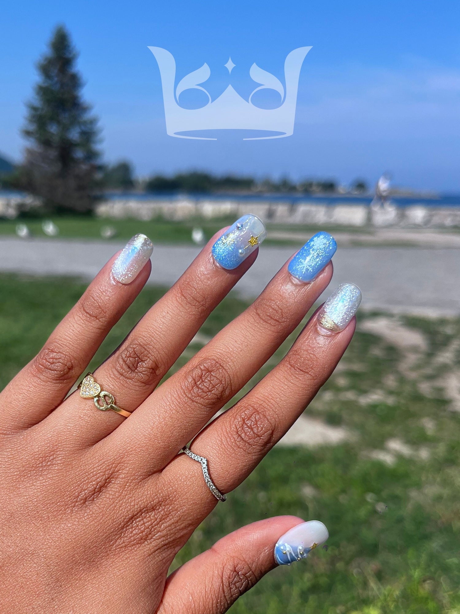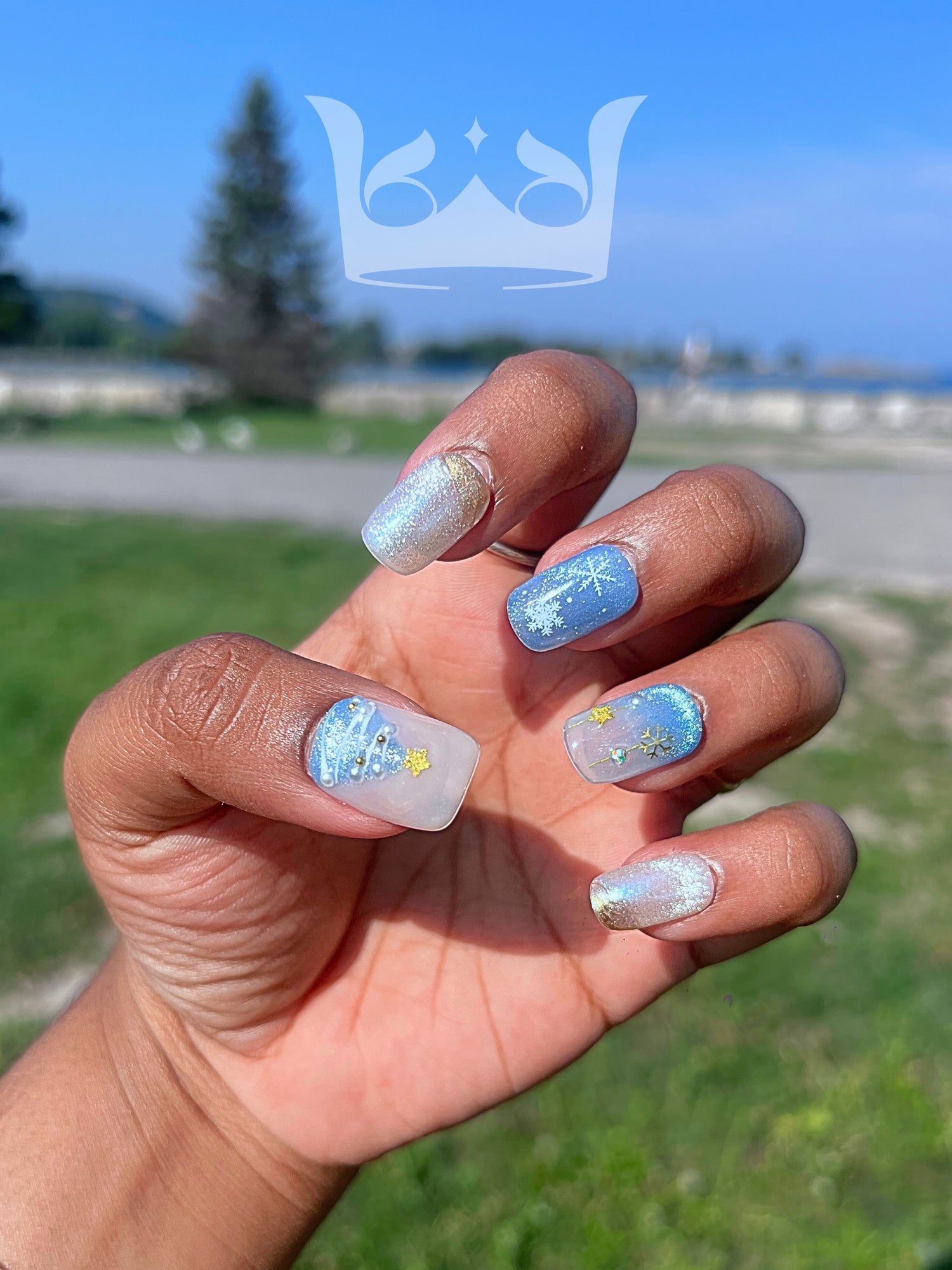 Like a frozen fractals glistening in the winter sun, each nail shimmers with hues of blue, silver and gold - an ode to Snow White's favorite festive palette.