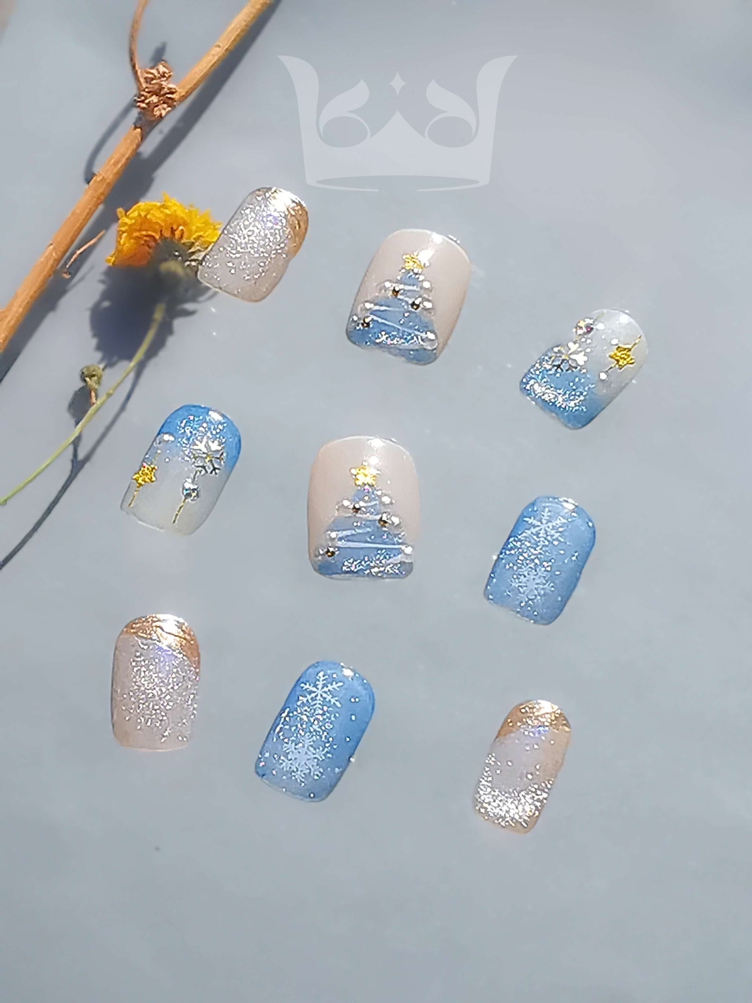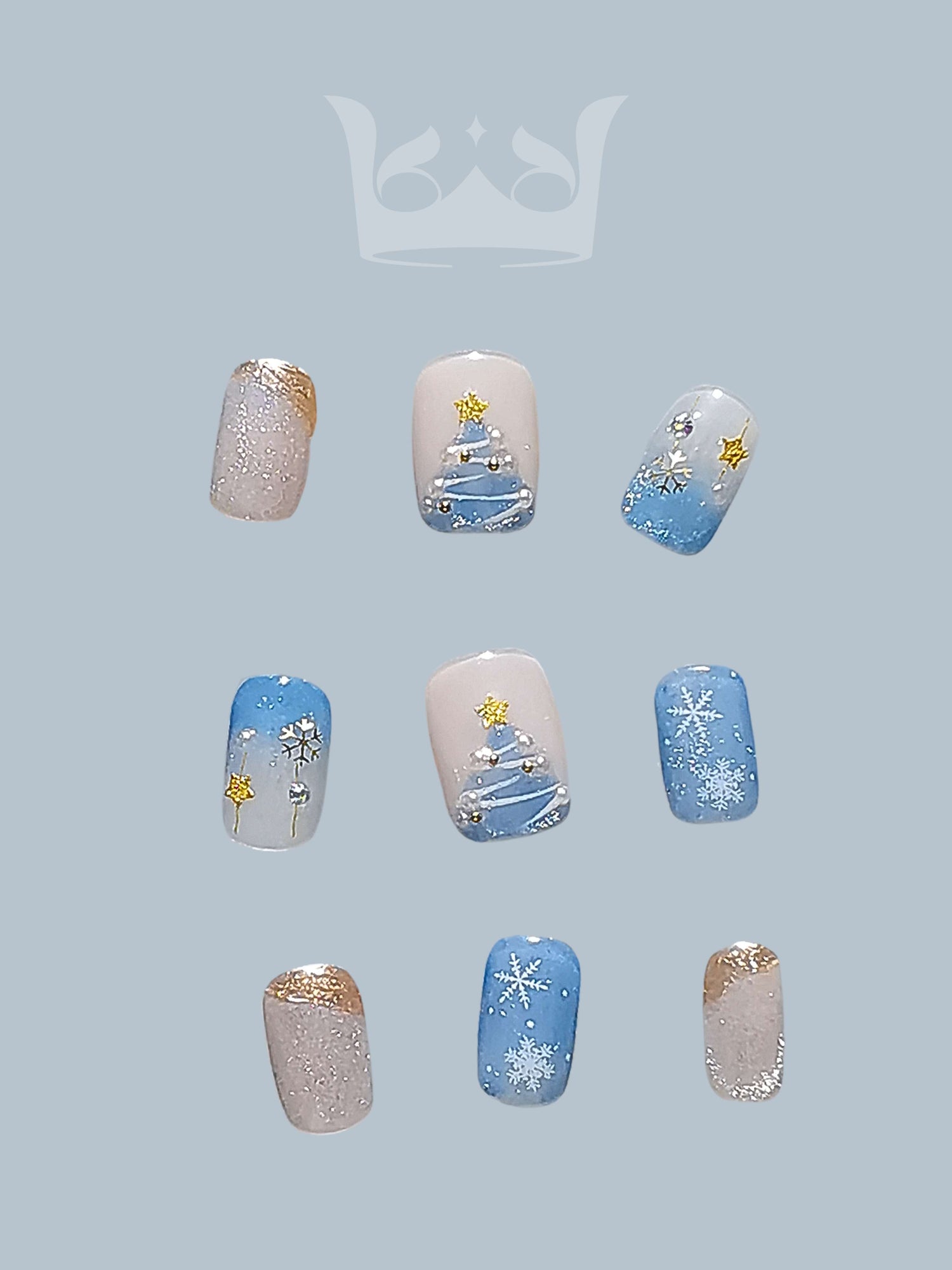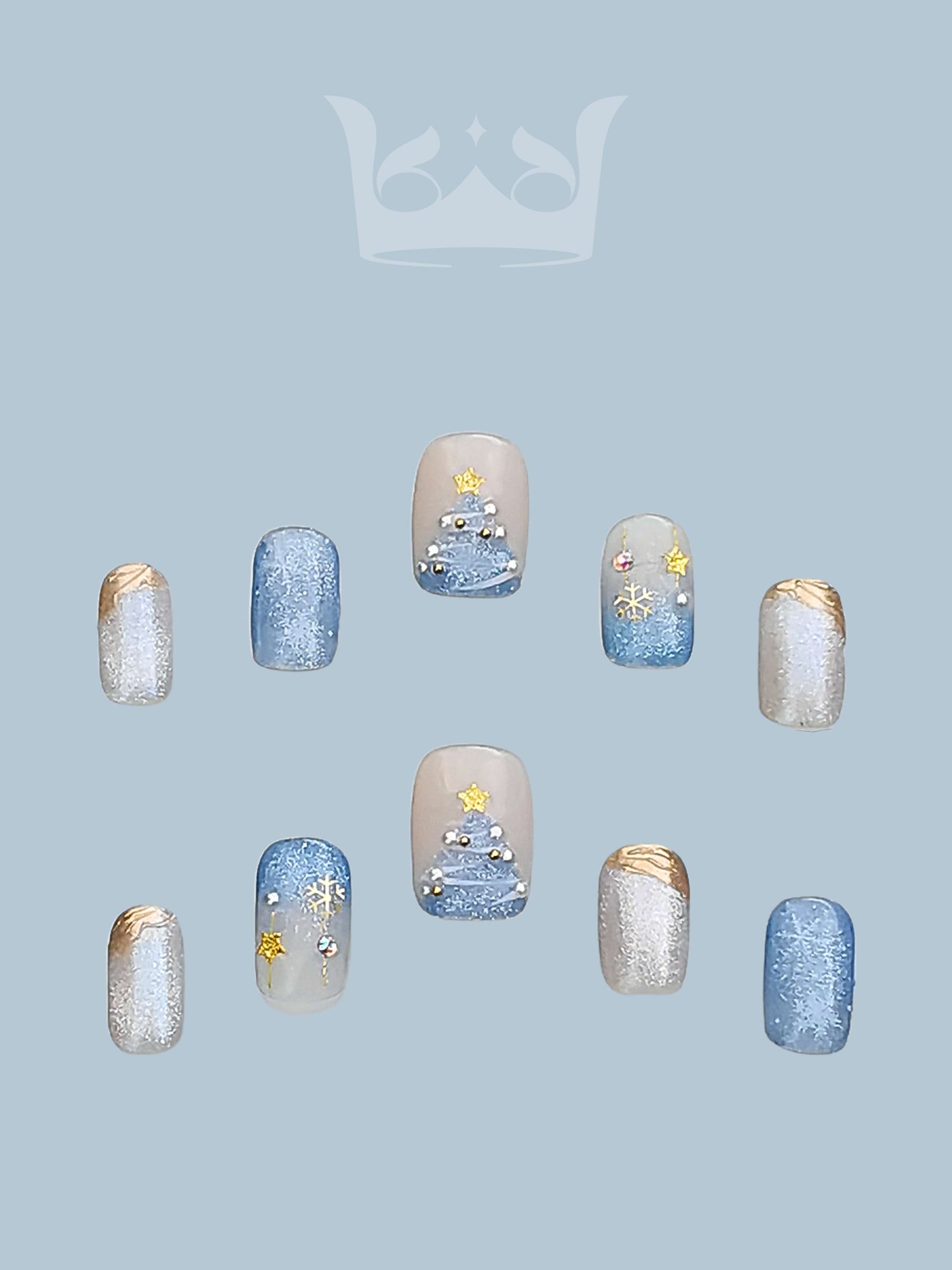 Snow White: Blue & Silver Squoval Short PressOn Nails with Christmas tree